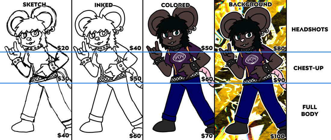 Multiple characters, high-res desktop backgrounds, animations, and nsfw vary in price, but I'm open to them. Expect roughly a price increase of 50% or more for any of those.